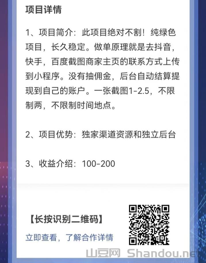 1、项目简介:此项目绝对不割!纯绿色项目,长久稳定。做单原理就是去抖音,快手,百度截图商家主页的联系方式上传到小程序。没有抽佣金,后台自动结算提现到自己的账户。一张截图1-2.5,不限质量,不限制时间地点。